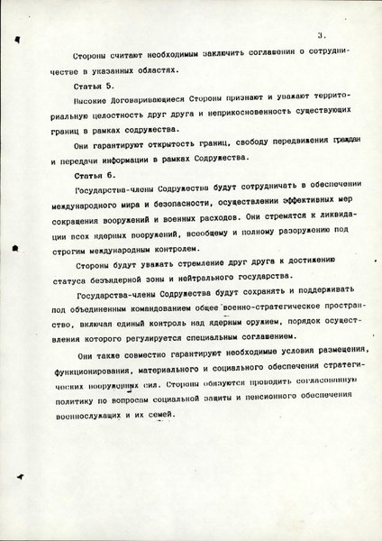 Как говорилось в соглашении, СНГ создавалось на основе «исторической общности народов и сложившихся между ними связях», с намерением «развивать свои отношения на основе взаимного признания и уважения государственного суверенитета, неотъемлемого права на самоопределение, принципов равноправия и невмешательства во внутренние дела, отказа от применения силы, экономических или любых других методов давления, других общепризнанных принципов и норм международного права».