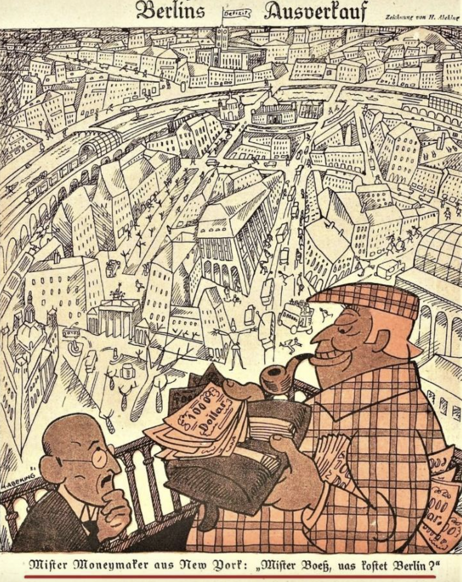 Другие европейцы и американцы вызывали такое же раздражение. Даже демократическая газета «Ulk» — из числа немногих, выступавших против ксенофобии, регулярно печатала карикатуры о засилье иностранцев. Повторявшийся в них сюжет – угроза немецкой идентичности Берлина и месту немцев в национальной иерархии у себя дома. Отрицательные персонажи – иностранцы, использующие несчастья Германии для обогащения – противопоставлялись обычным берлинцам, боровшимся за кусок хлеба.