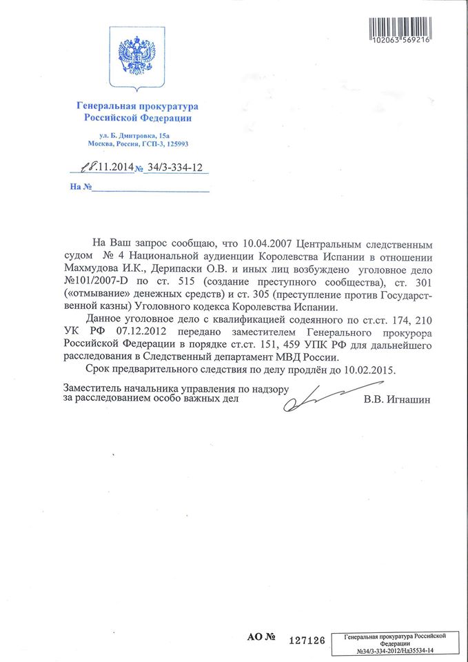 Материалы испанского следствия в отношении Махмудова были переданы в Россию в рамках международного следственного поручения в 2012 году. Из ответа на запрос «Трансперенси Интернейшл» мы узнаем, что Следственный департамент МВД проводит «дальнейшее расследование» по статьям 174 и 210 УК РФ (легализация и отмывание средств и создание преступного сообщества), в отношении Махмудова, Дерипаски и «других лиц» (фамилию Бокарева они также не озвучивают), а сроки следствия постоянно продлеваются.
