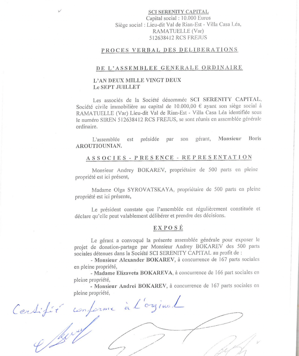 Во Франции обосновалась и семья Андрея Бокарева. Через компании SCI Serenity Capital, Immobilier Albert 1er SCI, Casa Lea II Property SCI, Bel'Ombre SCI он владеет имуществом в Париже, Сен-Тропе и Раматюэле. Причем, как обнаружил The Insider, часть активов олигарх после начала войны уже успел переписать на малолетних детей: 14-летнюю Елизавету, 8-летнего Андрея и 15-летнего Александра. Они выступают собственниками вместе с матерью — бывшей женой олигарха Ольгой Сыроватской.