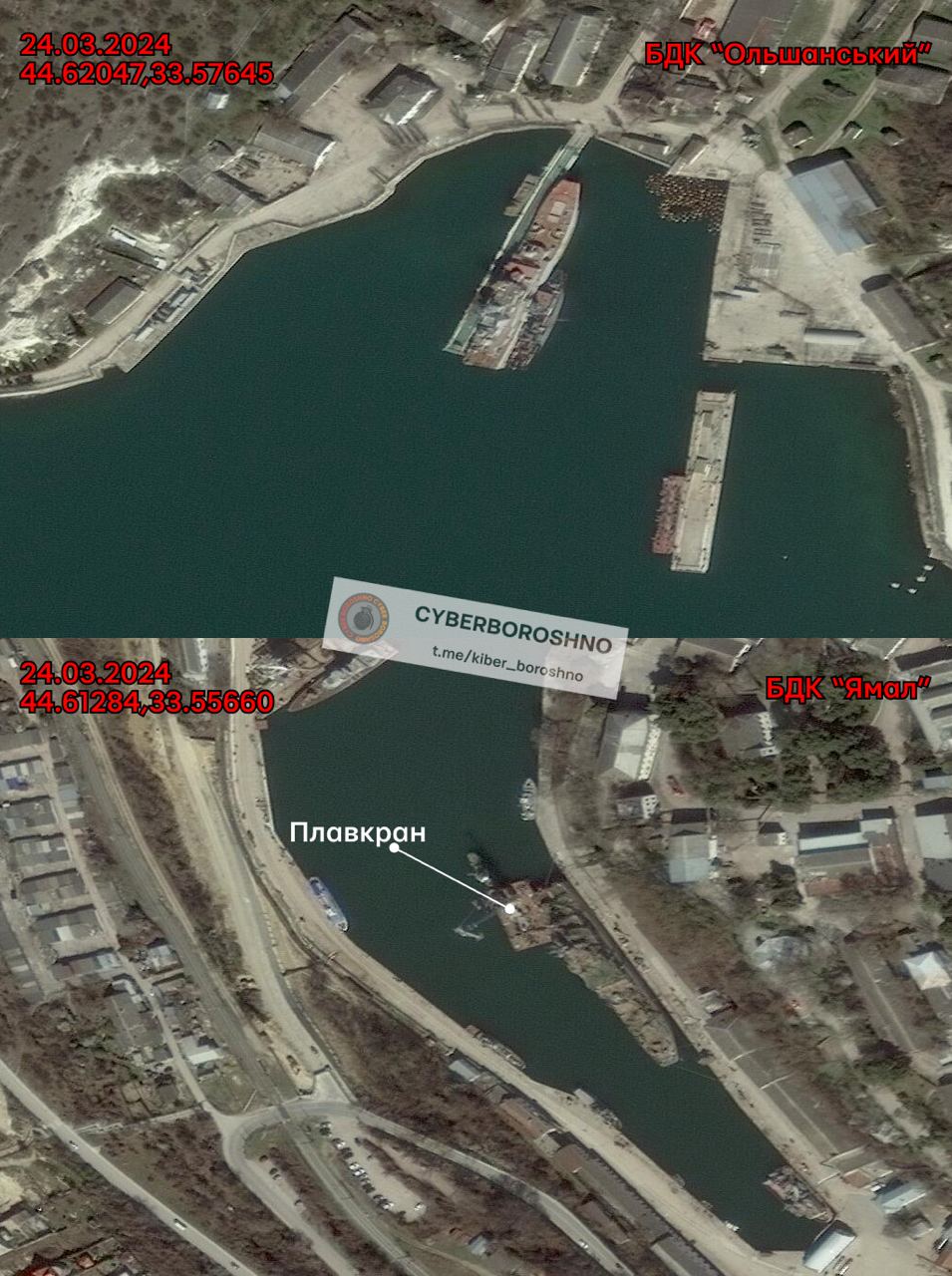 Аналитики украинского OSINT-проекта «КiберБорошно» утверждают, что спутниковые снимки БДК «Азов» свидетельствуют, что он был поражен во время ракетной атаки на Севастополь 24 марта. В частности, заметно, что корабль теперь накрыт маскировочной сетью.