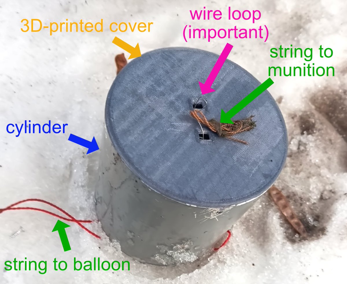 Украина использует недорогие аэростатные технологии в сочетании с современной электроникой для ударов по территории РФ, пишет исследователь DanielR. Он публикует фотографии одного из таких «ударных шаров» и объясняет его техническое устройство. Шар представляет собой длинный черный цилиндр, наполненный гелием или водородом. Полезная нагрузка распределяется по струне под воздушным шаром. На фото показано, где находится бутылка с зажигательной смесью, за которой следует контейнер с электроникой контроллера. Далее следует устройство слежения. В самом низу — боеприпас.
