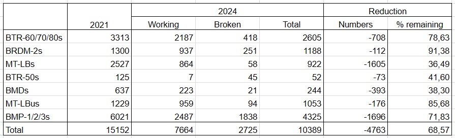 Всего из 8530 единиц бронетехники на складах в боеготовом состоянии находятся 5550 единиц.
