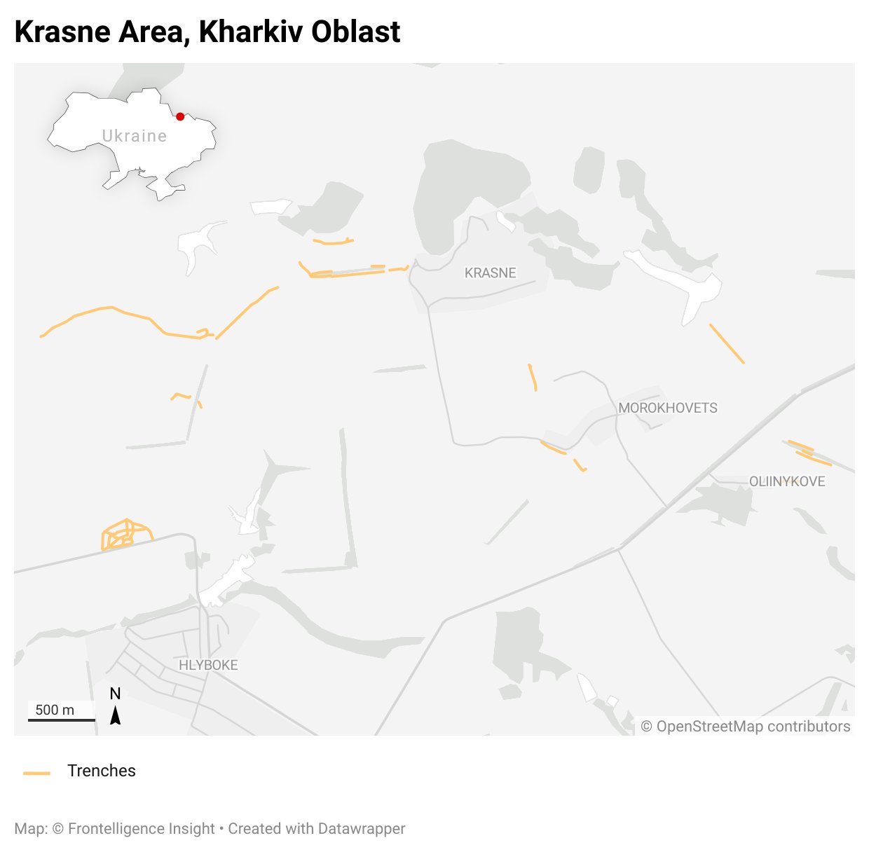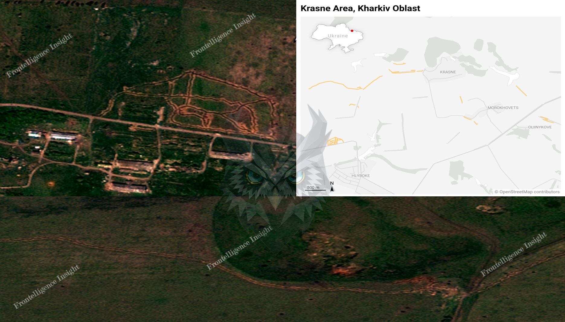 Tatarigami_UA подробно рассматривает один частный вопрос, касающийся отсутствия ИФС в районе продвижения российских войск на севере Харьковской области. При помощи спутниковых снимков исследователь показывает, что рядом с селами Красное и Глубокое по направлению на сам Харьков имелась система траншей и укреплений, а вот по направлению на Волчанск фортификационных сооружений оказалось гораздо меньше.