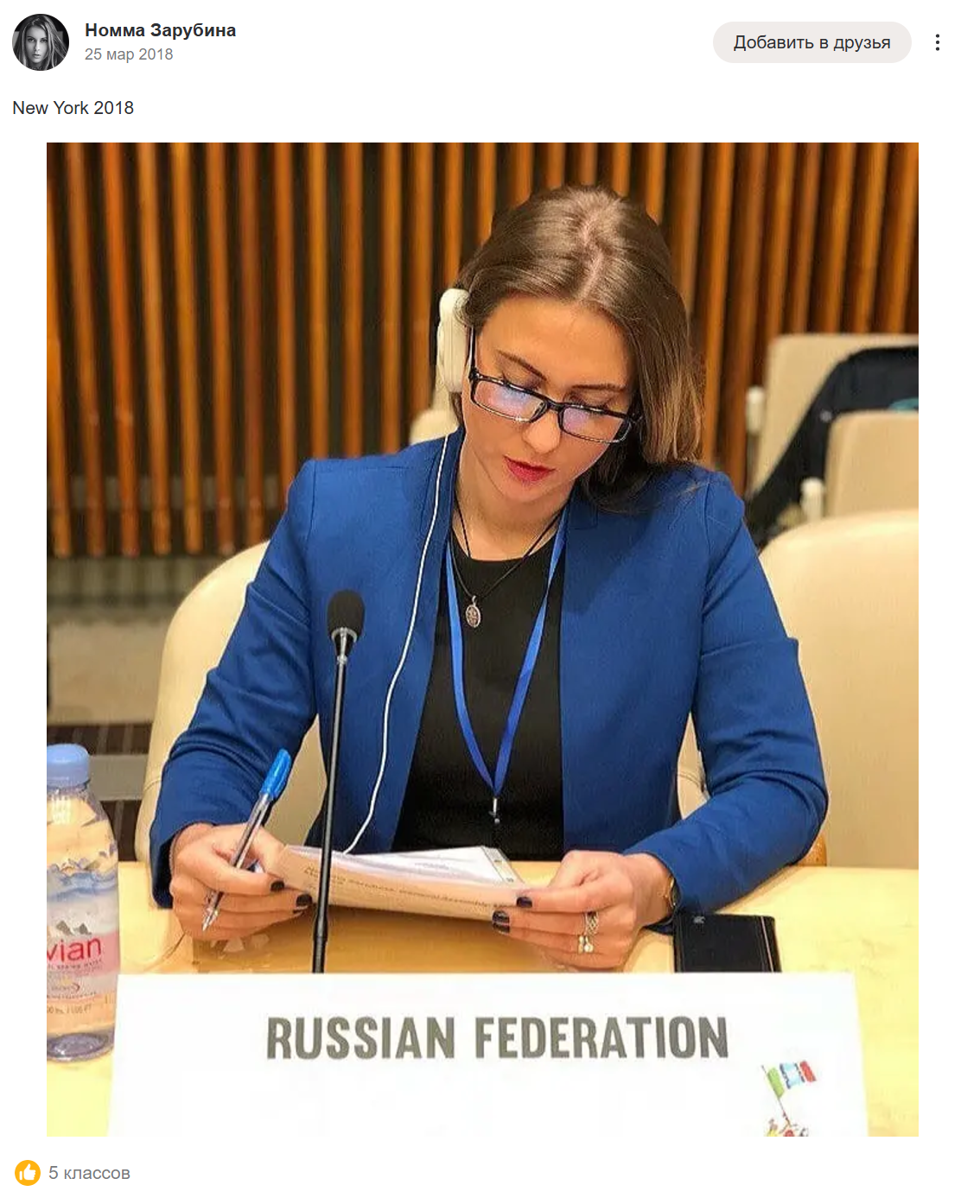 Российскую повестку к этому времени Зарубина продвигала уже давно, что видно не только по ее участию в «Российском культурном центре», но и в целом по ее соцсетям, пестрящим всевозможными патриотическими фотографиями: то она в свитере с надписью «Россия» на Красной площади, то фотографируется с российскими чиновниками, то представляет Россию в модели ООН, то дает интервью телеканалу «Россия», то с гордостью рапортует о своем участии в Петербургском экономическом форуме «с участием президента Российской Федерации», то вообще «на грани провала» позирует в футболке с надписью КГБ.