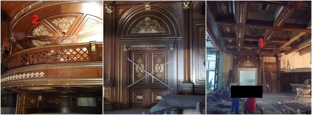 На фото Гостиной (илл. 7, 8) различим наборный паркет, резные деревянные пилястры (илл. 7, номер 1), тканевые обои (илл. 7, номер 2), классицистическое рассечение стены. Подобные интерьеры часты и повсеместны и в прошлом, и в современности. Это может быть современная Италия, Испания, лобби отеля в Турции. Там же часто можно встретить и кассетированный потолок (илл. 8). В центре потолка в овале расположена раскидистая розетка из листьев аканта (илл. 8, номер 1), она обрамлена ветками, похожими, например, на миланское рококо (илл. 8, номер 2), в соседних кессонах классицистические орнаменты - розетки с отходящими от них ветками (илл. 8, номер 3), завитки (илл. 8, номер 4), квадратные накладки из листьев аканта (илл. 8, номер 5), ряды античных иоников (илл. 8, номер 6).
