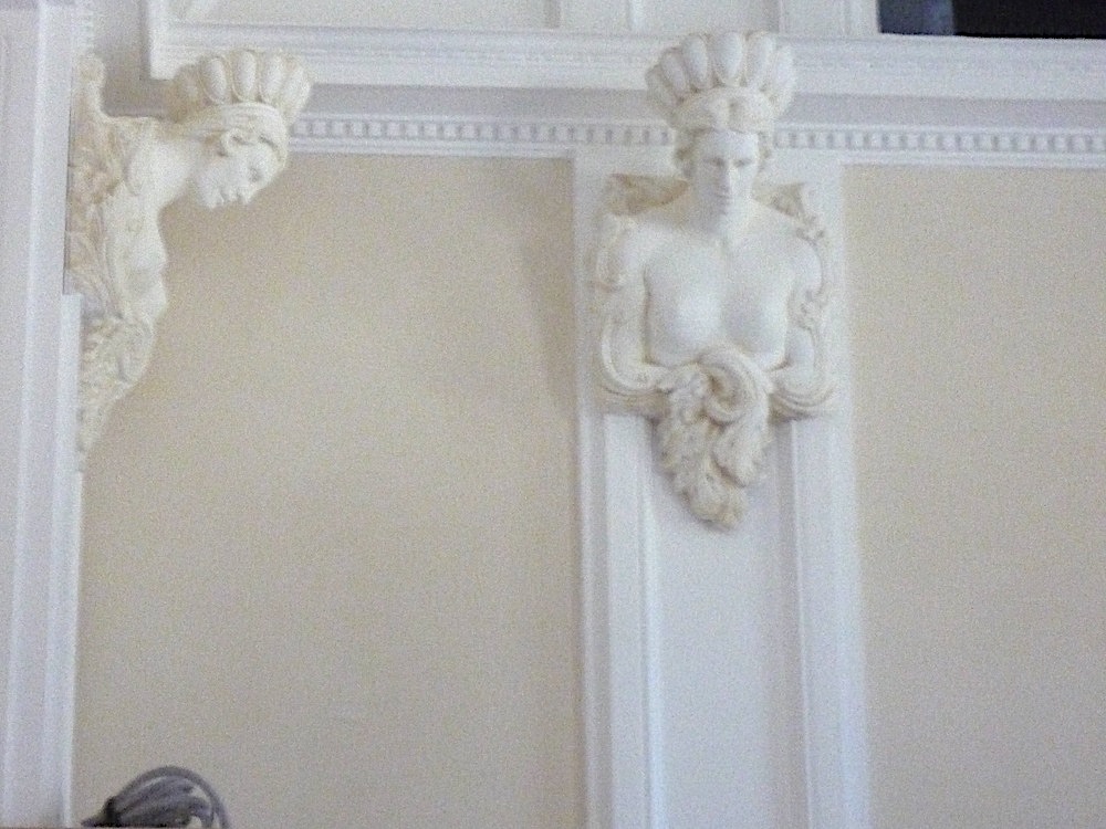 На фотографии 9 четче заметно, что орлы рельефные, помещены в прямоугольные панели (илл. 9, номер 1), линеарность которой подчеркнута золотом, выделены и нагели на углах (илл. 9, номер 2). Классицистична и филенчатая дверь и наличники с рядом иоников (илл. 9, номер 3). В эти очевидно дорогие интерьеры в потолок вдруг вставлены дешевые и не уютные для глаза осветительные приборы (илл. 9, номер 4).