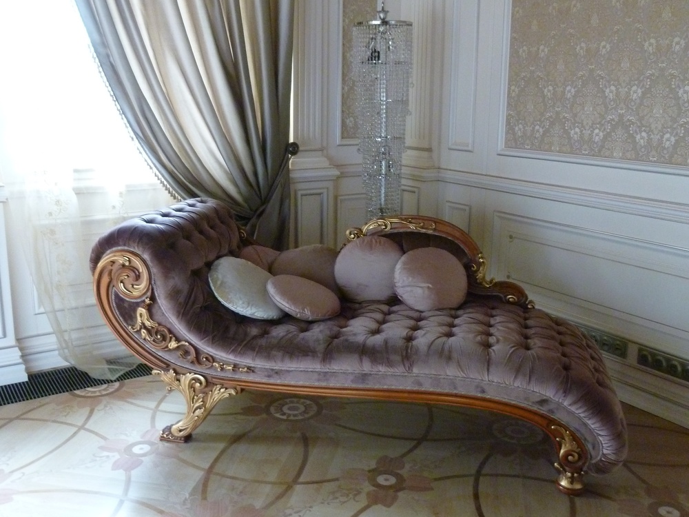 С этим временем можно связать два кресла и столик (галерея 7 -1), которые имеют свои прообразы в мебели Италии во второй половине XIX века. Тогда были особо популярны наборные мозаичные столешницы, когда на темном фоне выкладывались камнями букеты цветов. Вольтеровские кресла «с ушками», оказавшиеся в кадре комнаты на другом фото, приобрели особую популярность во Франции в 1830-1840-х годах (галерея 7 -2). Прообраз канапе (галерея 7 - 3) можно обнаружить во второй половине XIX века, во французском стиле «бель эпок».