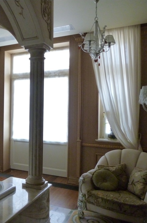 Элементы, выполненные в тонированном коричневом дереве: муфтированные стволы пилястр (илл. 8, номер 7), каннелюры (илл. 8, номер 8), капители (илл. 8, номер 9), сечение на прямоугольники, иногда заполняемое тканью, — это эхо европейского классицизма.