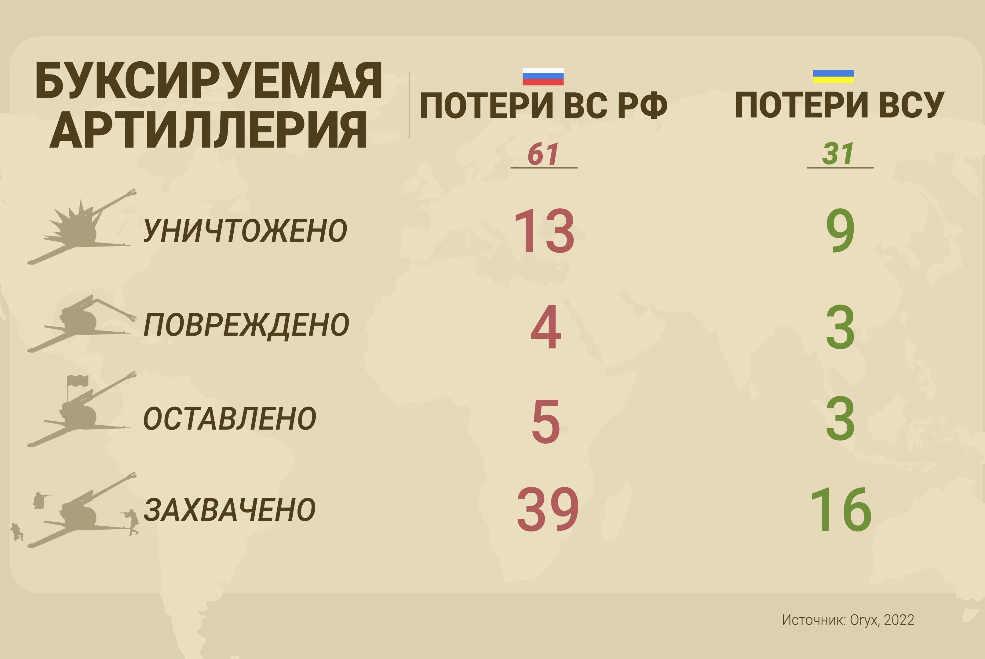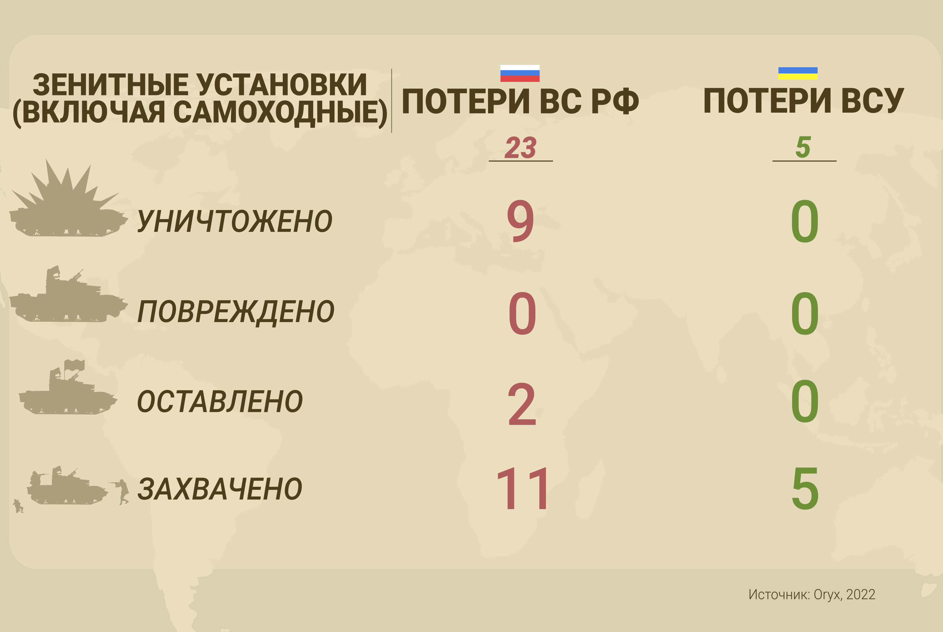 ВС РФ потеряли свыше 700 танков (в том числе более 200 самых массовых — Т-72Б3), из них только 400 уничтожили или повредили в бою, остальные пополнили ряды украинской армии. До половины и более потерь по другим категориям бронетехники также приходятся на оставленные и захваченные машины. Известные потери ВСУ на порядок меньше.